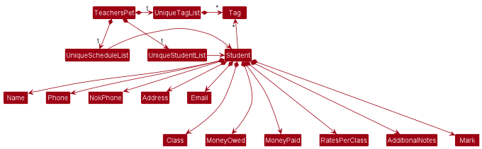 Tag list in the TeachersPet, which Student references. This allows TeachersPet to only require one Tag object per unique tag, instead of each Student needing their own Tag objects.