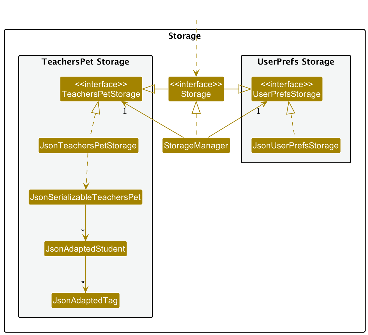 TeachersPetStorageandUserPrefStorage, which means it can be treated as either one (if only the functionality of only one is needed). - depends on some classes in the